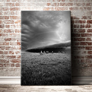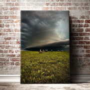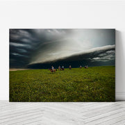 Experience the raw power of nature with 'Storm Clouds on the Prairie,' a striking photograph by local artist Garret Osgood. This captivating image features a dramatic storm cloud looming over the Kansas prairie, while courageous cowboys ride their horses beneath. The dynamic contrast of the storm's intensity and the resilience of the riders creates a powerful visual narrative. Available in various sizes, this photo brings the untamed spirit of the Kansas landscape into your home.