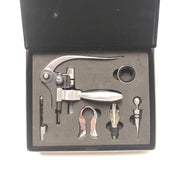 This wine opening set comes in a faux leather box. It includes a wine opener and spare cork screw, wine stopper, wine pouring spout, drip collar, and a foil cutter.