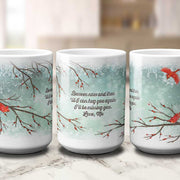 Cardinal sympathy gifts are a symbolic memorial memento that will warm their hearts every morning as they drink their morning coffee and remember t heir loved one. Beautiful teal and red winter motif features a sweet saying, "Between now and then 'til I can hug you again, I'll be missing you, Love, Me"