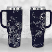 40 oz tumbler with handle, engraved with beautiful roses and wildflowers on 360° full-wrap floral line art design tumbler. Includes two straws and screw-in slide-mouth lid. Large capacity travel tumbler is a real thirst-quencher. Choose from all-over print, name, or monogram designs.