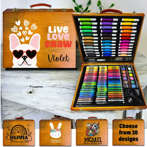 View full detailsBeautiful color printed art set in wooden carry case includes 150 pieces of art supplies, including crayons, pastels, markers and more.