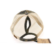 This Camouflage High Pony CC Ball cap adorned with a USA Flag Patch is right on trend to wear with all of your favorite summer wear.  You will love the fit and comfort of this adorable new high pony ball cap!