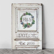 Personalized Canvas Wall Decor featuring Old Wooden Door with Succulent Wreath and Couple's Initials