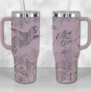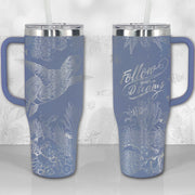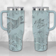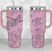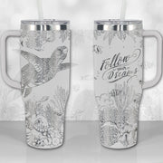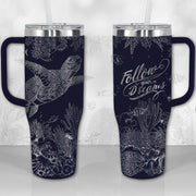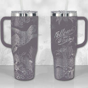 40 oz tumbler with handle, engraved with beautiful 360° full-wrap with a beautiful engraved sea turtle design swimming in a coral reef. Perfect gift for someone who loves the ocean or sea turtles. Choose motivational quote "Follow your dreams" or add your own custom name or text. Includes two straws and screw-in slide-mouth lid. Large capacity travel tumbler is a real thirst-quencher. Choose from all-over print, name, or monogram designs.
